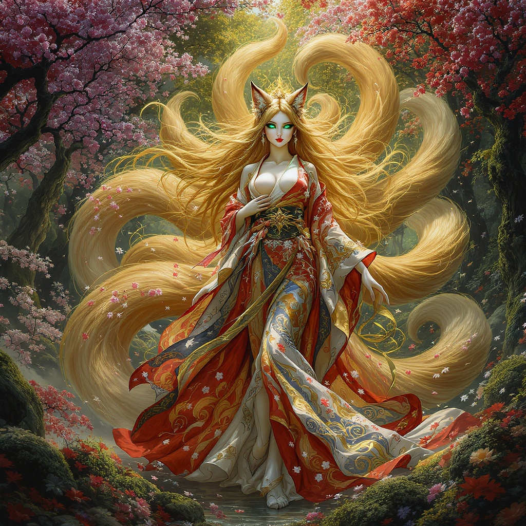 In this hyper-maximalist masterpiece, an awe-inspiring image of the ultimate emerges. She stands within an enchanted forest, radiating ethereal grace. Her flowing hair, a molten gold hue, glimmers with inner brilliance. Her iridescent emerald eyes, imbued with ancient wisdom and playfulness, captivate the soul. Her porcelain-like skin bears delicate cherry blossom motifs that shift subtly with the light. Nine magnificent tails, embellished with designs influenced by various art movements, create a mesmerizing visual melody. Her exquisite kimono, drawing inspiration from traditional Japanese woodblock art, showcases meticulous detail. The enchanting forest bursts with lively colors, merging surrealism and fantasy. This epic creation evokes wonder, blending hyper-realistic rendering, intricate details, and a seamless fusion of styles. It stands as a groundbreaking testament to the artist's skill, drawing viewers into a realm where beauty and magic coexist. With unparalleled attention to detail, it transcends visual boundaries, offering a timeless encounter with the extraordinary nine-tailed fox girl—a stunning embodiment of artistic mastery.
