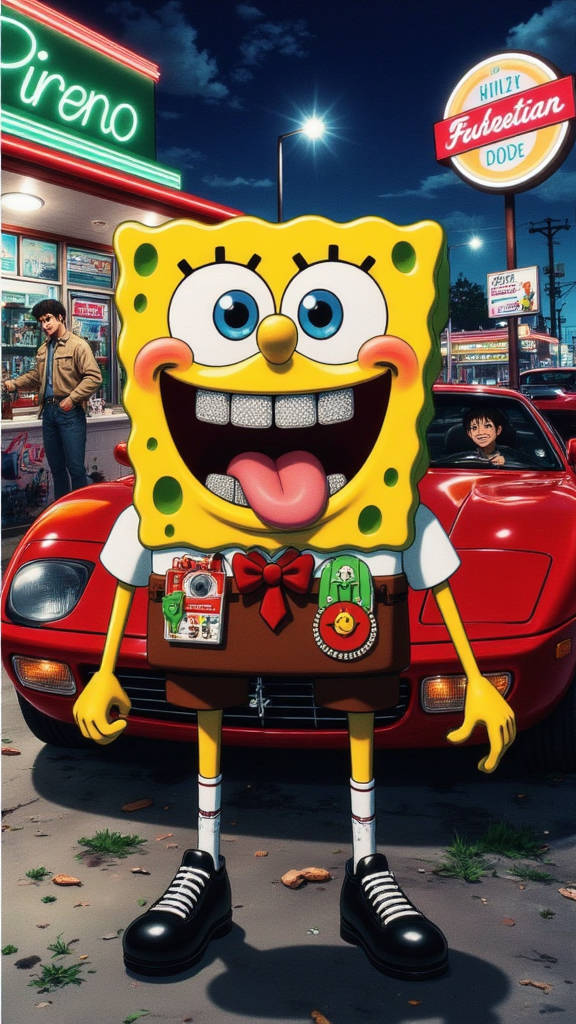 View this AI-generated image featuring spongebob wearing gr llz in his mouth with a large smile vintage anime diner man driving a red ferrari parked outside wearing a letterman jacket and leather gloves neon lighting retro. Created using advanced AI technology, this image showcases anime style. Perf