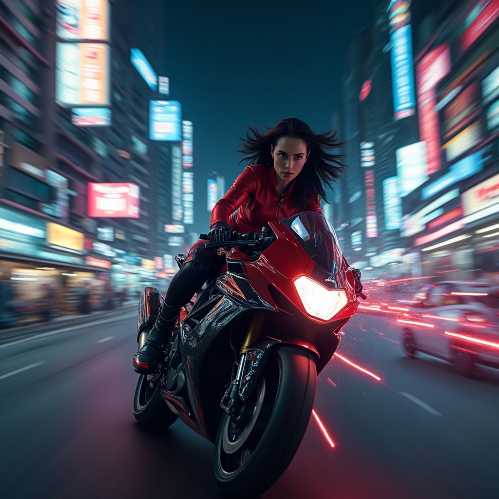 A woman zooms through a neon-soaked cyberpunk cityscape on a sleek motorcycle, its colorful lights trailing like electric comets in the night. She's clad in form-fitting red and black attire, perfectly aerodynamic as she maneuvers through the bustling streets. Motion blur enhances the sense of speed, as if time itself struggles to keep pace. This high-octane chase pulses with dark intensity, the night air charged with suspense and adrenaline. In this vivid, photo-realistic scene, cinematic lighting highlights her determined expression, each dramatic moment captured in grainy, filmic detail. A masterpiece unfolds in high resolution, an illustration of dynamic action and vibrant energy. The city streets twist surreally beneath her, a contrast of sharp reality and a dream-like chase, painting a landscape of vivid hues against the shadowy urban backdrop.