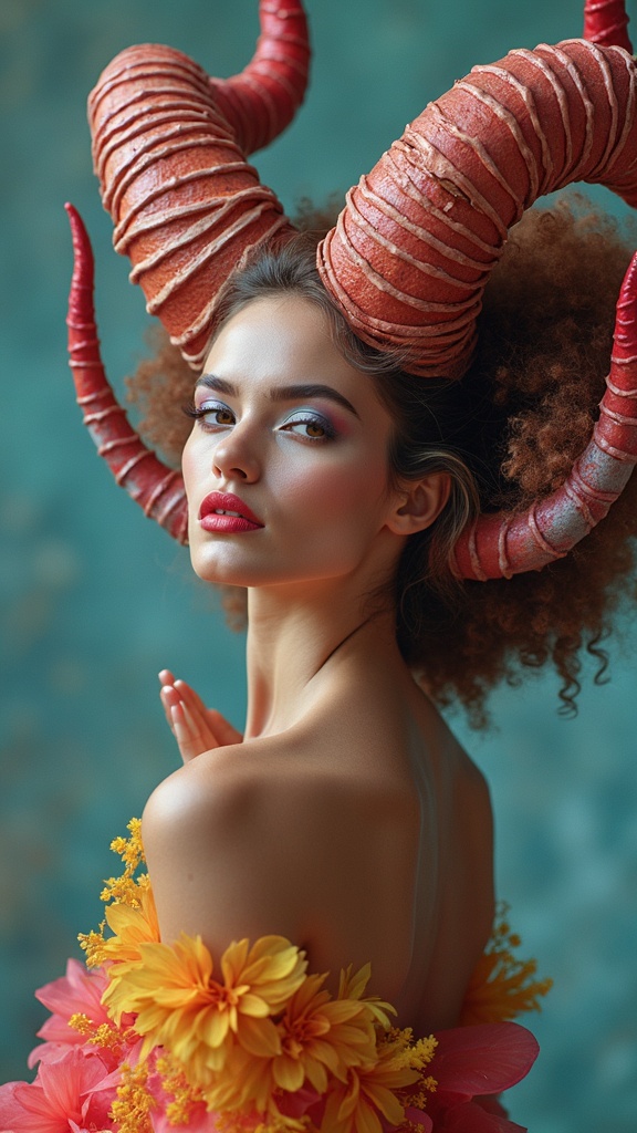 View this AI-generated image featuring a vibrant and dynamic portrait of a woman confidently posing with elaborately crafted horns on her head inspired by the innovative style of brian jungen and the fashion forward vision of steven meisel the image features vivid colors and meticulous detail showca