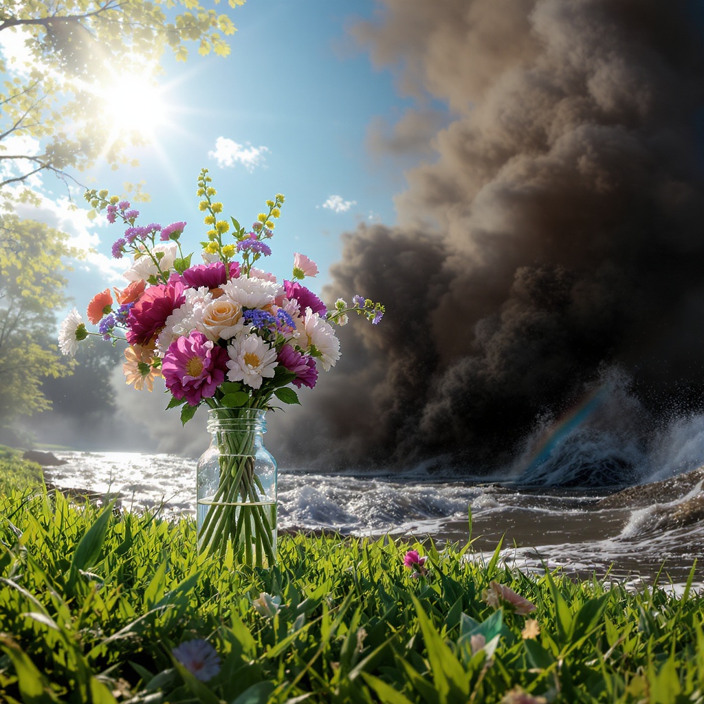 A vibrant scene of colorful flowers encased in a glass bottle resting on lush green grass, bathed in breaking sunlight, evokes the warmth of a spring day with a crystal-clear blue sky. The setting is highly detailed, with a focus on cinematic quality reminiscent of 8k UHD imagery. Incorporating elements of contrast, such as a dark, tumultuous river, adds drama and a nervous energy to the atmosphere. Rendered in HDR CGI, the scene combines both beauty and intensity, offering a captivating, dynamic visual experience.