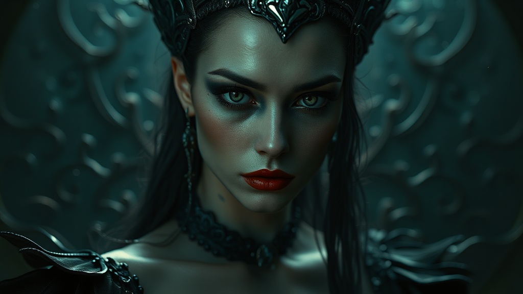 A hauntingly beautiful portrait of the Queen of the Damned, exuding femme fatale allure with a morbid, dark elegance. Her figure is artfully rendered in hyper-detailed, photorealistic style, capturing the essence of a dense, atmospheric night. Her skin glistens with a wet sheen under soft, natural lighting, reminiscent of epic, dramatic scenes. The shot, inspired by the works of Irakli Nadar and Reylia Slaby, offers an eerie, empty yet captivating ambiance akin to trail cam footage. Set against a backdrop of intricate, hyperornate details, the image invites viewers into her mysterious realm with a subtle play of shadows and whispers of the unseen.