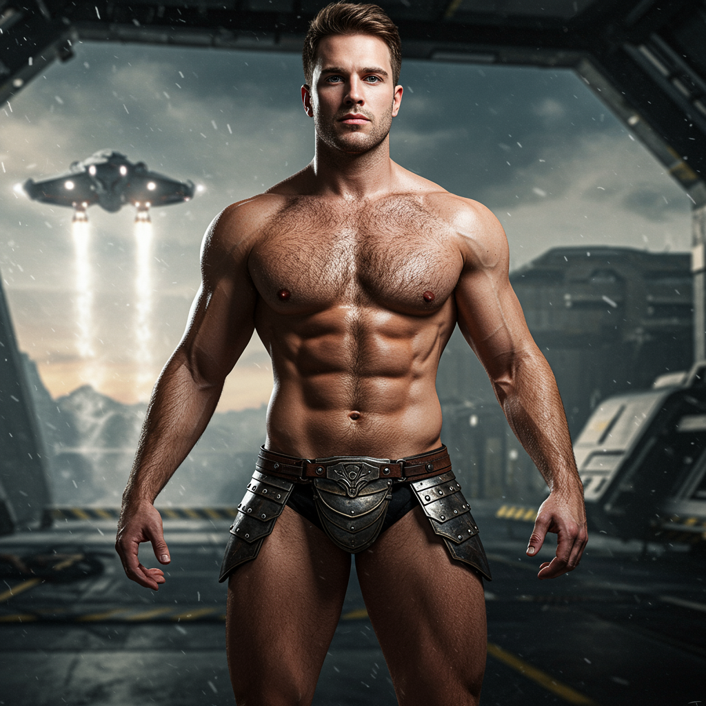 Ultrarealistic portrait photograph showcasing a full-body triangulation of a 28-year-old Israeli Caucasian male, with a wide field of view, capturing a dominant alpha male physique, muscular and perfect, with a hairy chest and slightly smaller head, featuring shiny hair. Set in a cinematic, sci-fi backdrop at a spaceport, with a sci-fi ship taking off in the background, the scene is atmospheric and overcast. The male figure is adorned in intricately detailed plate leather armor, exuding fine detail reminiscent of 'pursuit' by Gesaffelstein. The photograph exhibits natural lighting and textures, with cinematic lighting creating a moody yet bright ambiance. The hyper-realistic and vibrant 8K ultra-HD rendering captures the vivid details of the scene, alongside natural blur and volumetric lighting. The action pose and epic scene create a movie-style, photorealistic, high-quality impression. The image expertly utilizes ray tracing to achieve the highest detail, avoiding any potential for low-quality artifacts, and maintaining a focus on natural composition.
