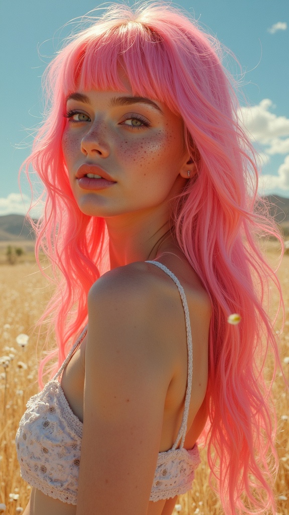 A hyper-realistic painting of a woman with vibrant pink hair, reminiscent of an Artgerm style, graces the cover of a prestigious fashion journal. She stands in a sun-drenched scene with the naturalistic technique that echoes the works displayed in the Bill Lowe Gallery. Her soft freckles and youthful beauty evoke the essence of a young Liv Tyler. Infused with the sleek design aesthetics of Marc Newson and the whimsical allure of Suki, this perfect specimen of a human female is both idealized and surreal. Her skin possesses a warm, golden glow, giving her a slightly ethereal, almost plastic Barbie-like appearance, blending hyper-realism with a subtle fantastical element. The influence of modern digital art platforms like Abduzeedo is evident in the composition's contemporary flair.