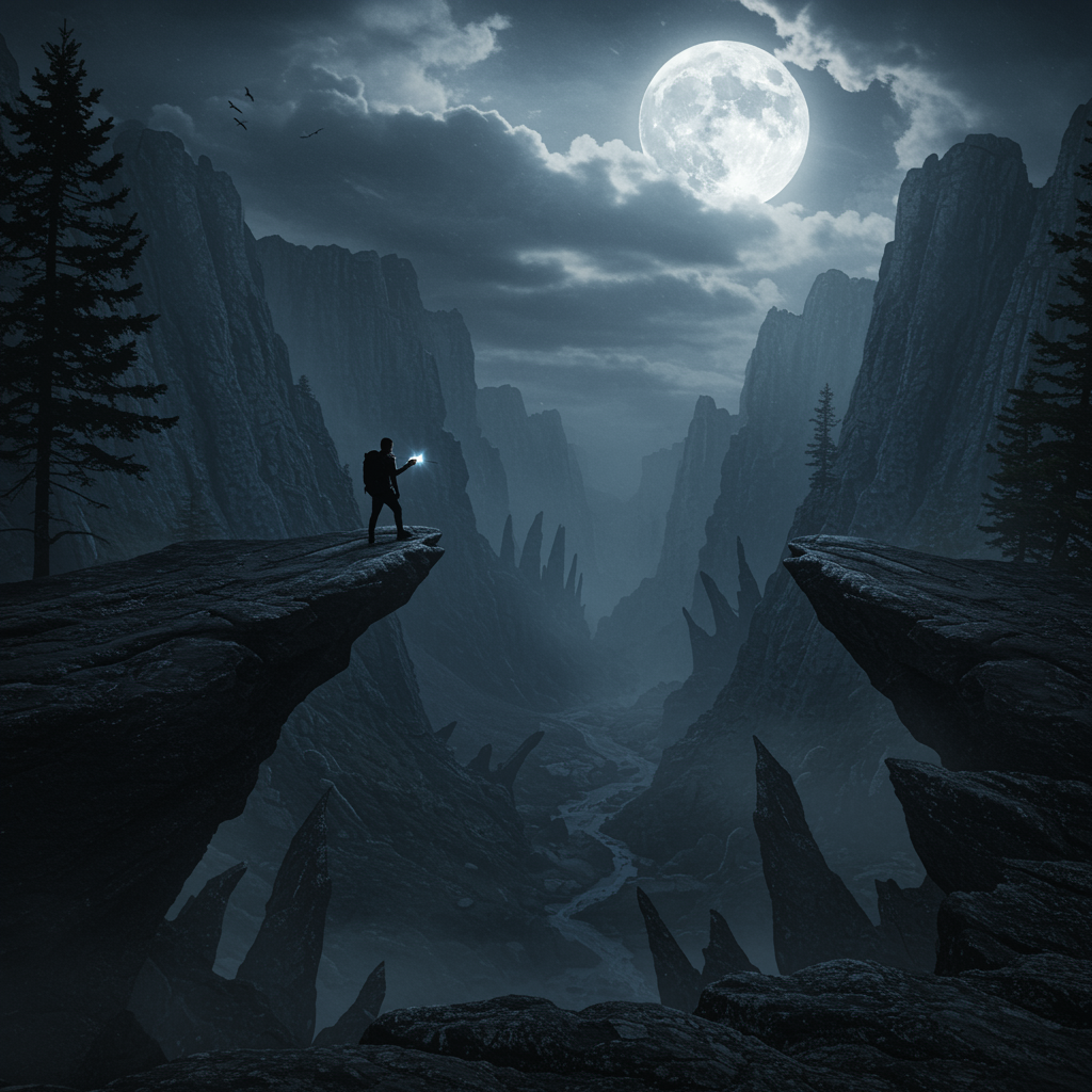A mysterious and cinematic landscape unfolds with a solitary figure perched on a rugged cliff, surveying a foreboding valley below. The figure is a silhouette set against a tumultuous sky, where a full moon casts an unsettling, silvery light. The valley beneath is cloaked in dense shadows, revealing glimpses of gnarled trees, sharp boulders, and treacherous chasms amidst the darkness. The scene is enveloped in an atmospheric and suspenseful aura, amplified by the distant howl of a chilling wind and the ethereal glow of the moonlight.