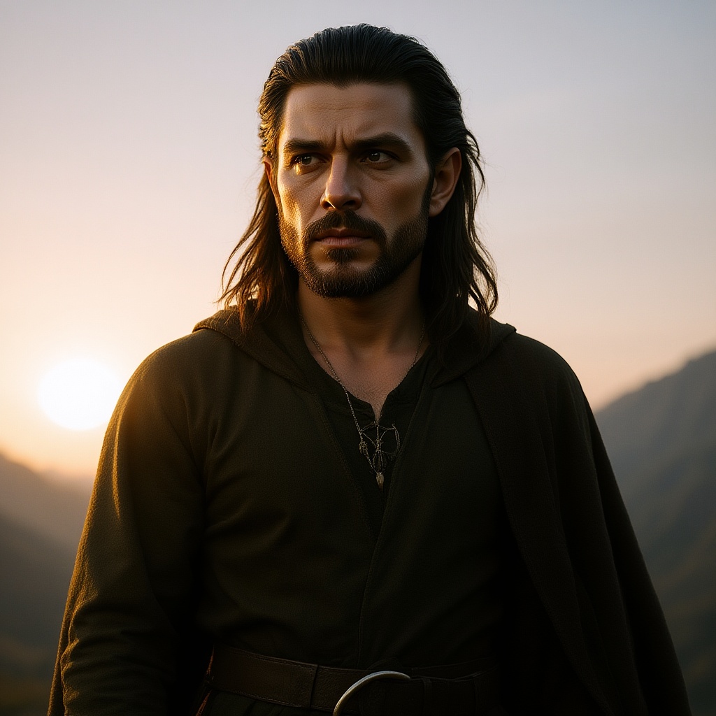 Portrait of an ultra-realistic Legolas from Lord of the Rings with intense dramatic lighting captured during a pale sunrise; the scene features cinematic lighting that highlights his battle-worn features, depicted from a low angle to enhance his heroic stature; presents an image of hyper-realism and extreme detail, evocative of a masterpiece trending on ArtStation; rendered in 4K using Unreal Engine 5, the focus is on capturing the essence of his character with unparalleled clarity, set against the serene yet powerful backdrop of a misty morning horizon.