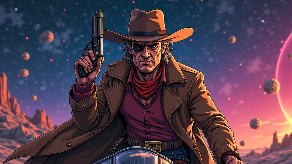 John Wayne reimagined as an anime-inspired space cowboy, set in a world reminiscent of Cowboy Bebop and Trigun. A rugged, stoic figure piloting a weathered starship across the neon-lit galaxies, his duster coat flowing like a cape. With a classic cowboy hat tilted over one eye and a laser revolver in hand, he navigates the lawless frontiers of space. His trusty robot sidekick and crew of colorful misfits join him on thrilling adventures through asteroid fields and cosmic saloons. The scene captures the fusion of gritty western motifs with futuristic sci-fi elements, blending the old-world charm of the Wild West with a vibrant, interstellar landscape.