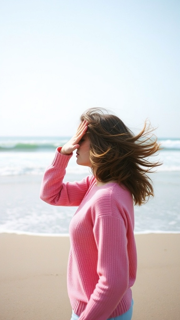 View this AI-generated image featuring a woman in a rosy pink sweater shields her eyes with one hand standing on a sandy beach as the waves relentlessly meet the shore the brisk wind dances through her hair giving it a wild billowing form captured from afar the photo exhibits a nostalgic film grain