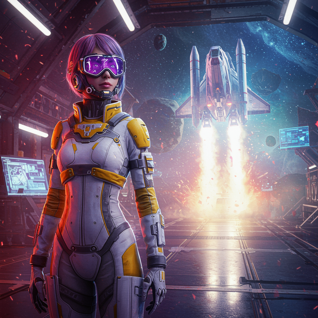 A female figure stands confidently in a sleek, form-fitting white and yellow jumpsuit, adorned with intricate details, in a bustling spaceport. Behind her, a spacecraft dramatically takes off, illuminating the scene with vibrant colors. Her face is partially concealed by a futuristic mask, while a shimmering purple sci-fi visor shields her eyes. The atmosphere is charged with a sense of adventure, captured with cinematic lighting and hyperrealistic details. The environment exudes a surreal and divine quality, blending elements of manga and anime with a celestial ambiance. The scene is beautifully rendered with intricate colors and Lumen reflections, creating a masterpiece that appears both smooth and shiny. Despite the intense details, the composition remains clean and focused, avoiding any visual imperfections or errors that might detract from the captivating vista.