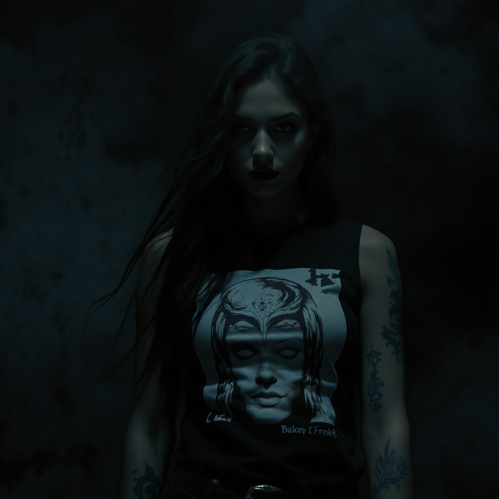 View this AI-generated image featuring a cinematic and moody image of a mysterious female rapper with long flowing hair draped down her back revealing a striking tattoo on her arm she s dressed in a monochrome graphic muscle tee exuding an enigmatic and captivating presence the setting is dimly lit
