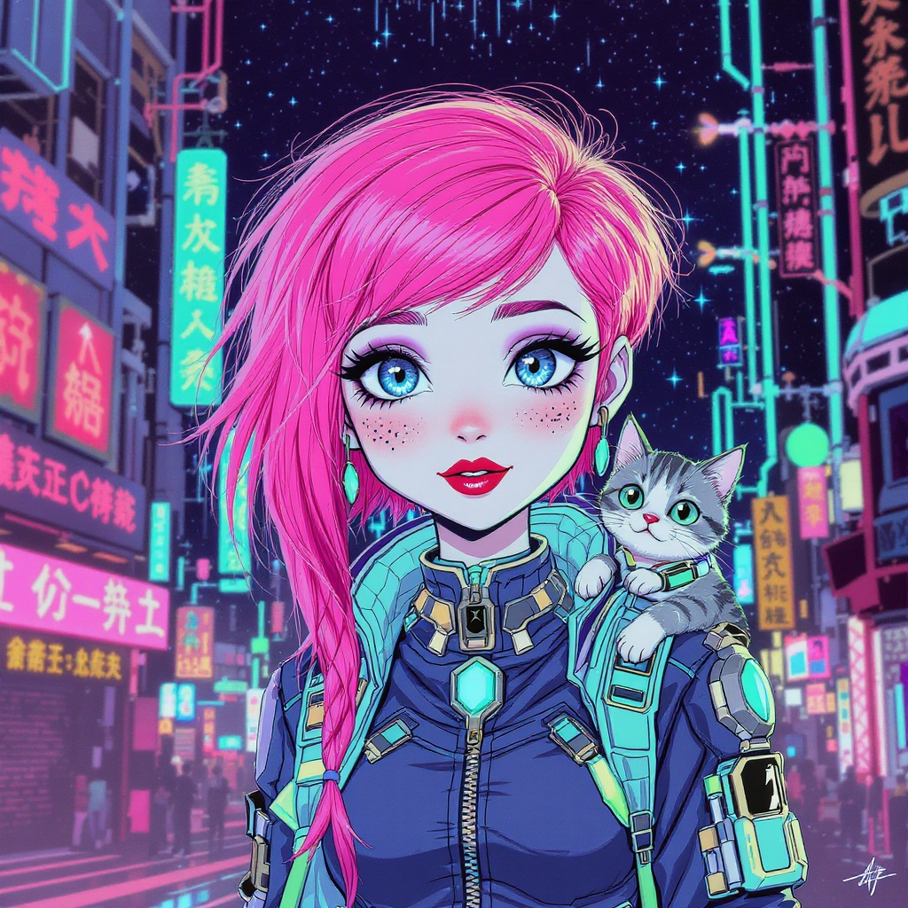 View this AI-generated image featuring an illustration featuring a quirky girl with vibrant pink hair styled in the flat shading technique reminiscent of gemma correll s work her face is adorned with playful freckles and a curious cat perches on her shoulder the scene is infused with a cyberpunk vib
