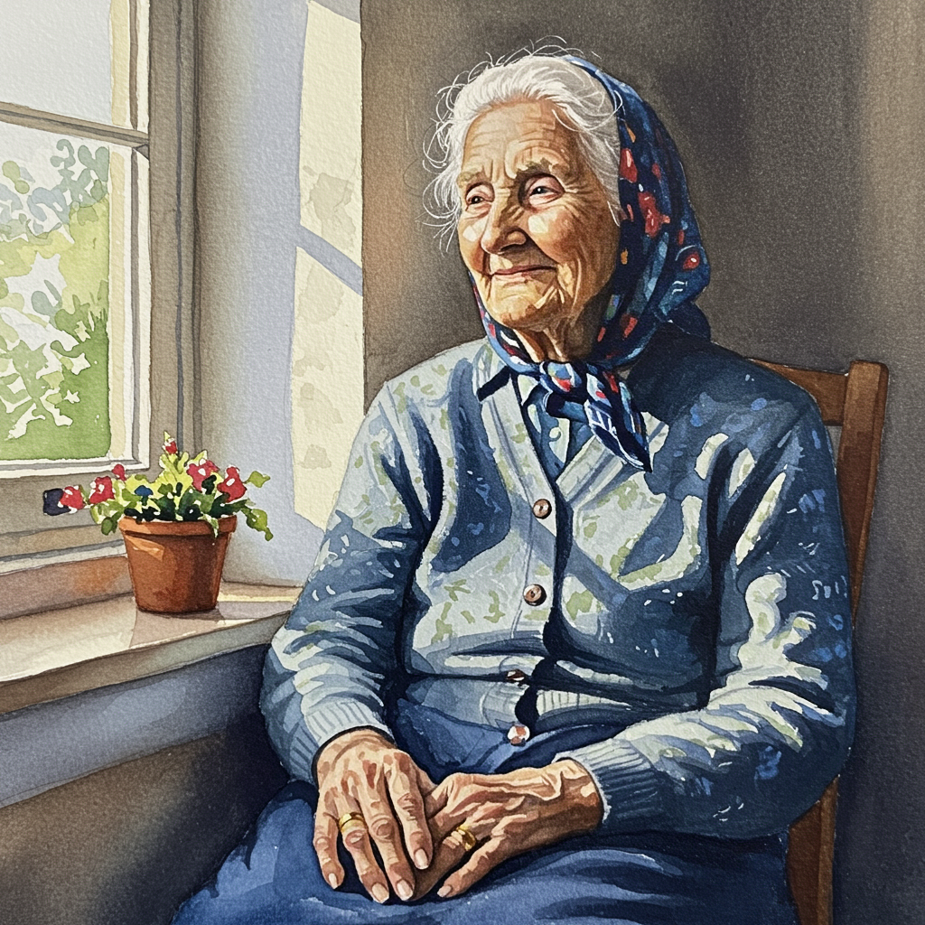 View this AI-generated image featuring a watercolor painting captures a wise elder seated near a window where the afternoon light softly bathes her weathered hands resting gently in her lap her eyes touched with a gentle smile suggest a mind wandering through memories of life s simple beauties the i