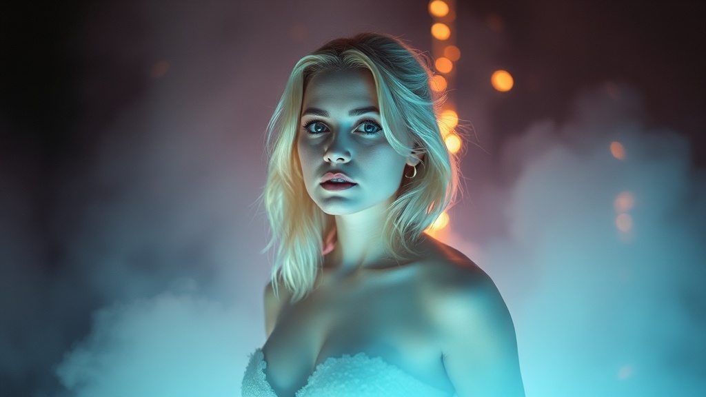 A blonde woman standing in ethereal, atmospheric lighting, surrounded by a dreamlike aura that enhances her features; the scene is beautifully chaotic, with soft tones and a vertical composition that emphasizes a sense of elegance and mystery. The ambiance exudes a stylized and imaginative quality, blending surreal elements with a captivating, modern aesthetic.