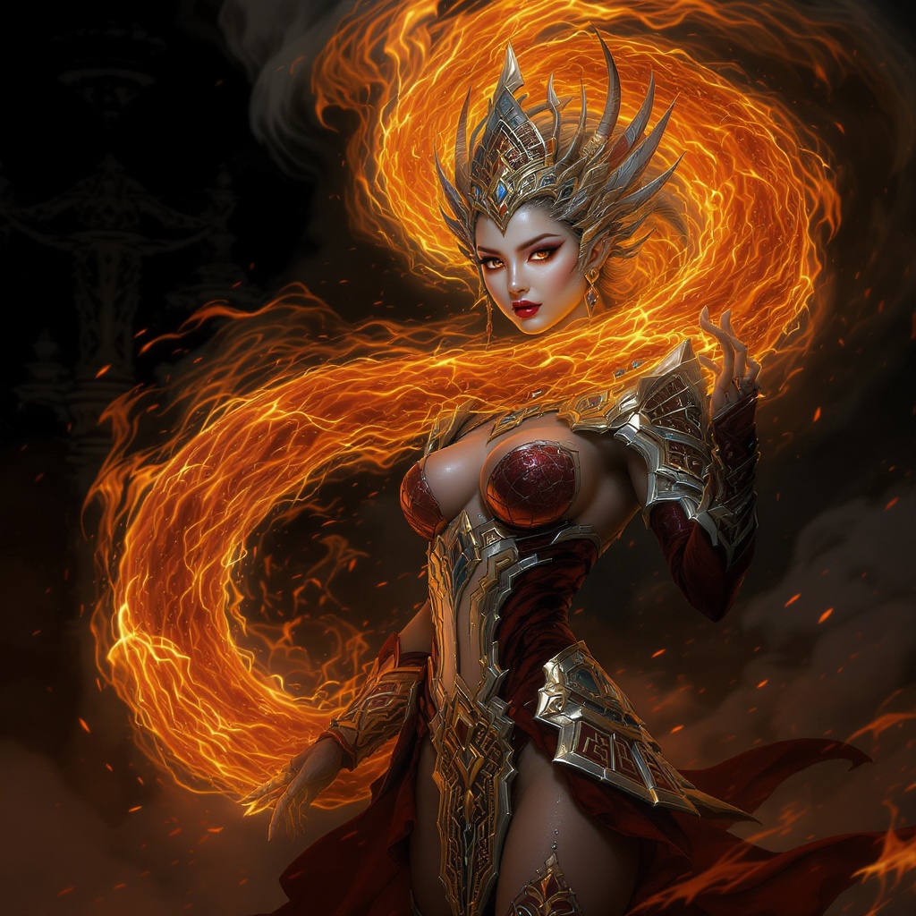 A stunning hyper-maximalist depiction of a young and beautiful Queen of Fire, enveloped in a swirling tongue of flame, set against a tribal dark fantasy backdrop. Her regal full-body pose exudes elegance and power, adorned in intricately designed garments that meld traditional motifs with futuristic elements like circuit board patterns. Her face, a portrait of perfection, is highlighted by intense lighting and dramatic shadows, adding depth to her mystique. This photorealistic concept art, inspired by cinematic storytelling, achieves an ultra-detailed quality through 8k resolution and a 3D octane render, capturing every nuance with sharp focus. The composition is masterfully crafted, offering a wallpaper-level clarity and an HDR finish, embodying the essence of high-definition stylized visual art, perfect for an immersive experience.