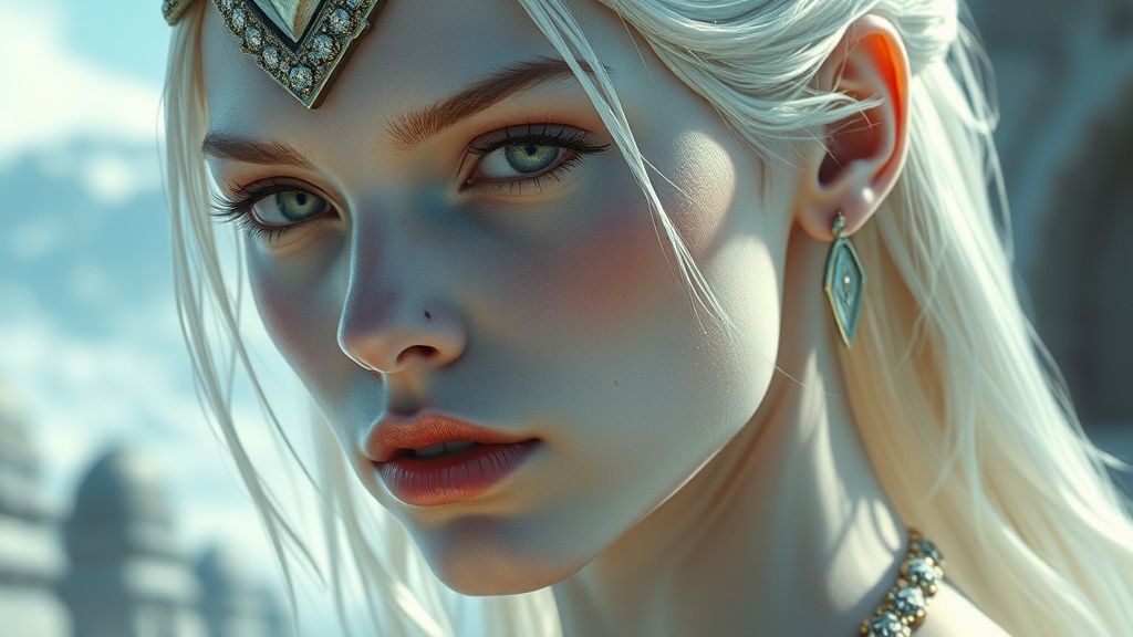 In a realm of fantasy and myth, an ancient ethereal queen of otherworldly allure captivates with her presence. Her smooth skin, pale as white ash, shimmers with a celestial glow, and her athletic form embodies grace and strength. This close-up portrait captures the depth of her powerful emotions, rendered in bright and highly detailed digital art. The scene blends imaginative fantasy and science fiction with mythological themes, set in an epic landscape that stirs a sense of grand adventure. The composition is rich with intricate details that transport viewers to a surreal world of boundless imagination, reflecting the influence of artists like Julie Bell. This masterpiece, with its high-quality execution, invites viewers to explore a tapestry of fantastical elegance and vivid storytelling.