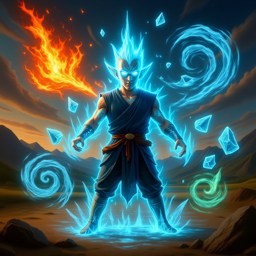 In a dynamic scene, Aang, the last airbender, stands as a formidable figure, exuding an aura of intense power and serenity. His eyes and tattoos glow with a bright, ethereal blue light as he enters the Avatar State, a testament to his deep connection with the spirit world. Around him, each element swirls in a breathtaking display: flames dance and flicker with vibrant shades of orange and red, water forms intricate spirals and frozen shards in shades of deep blue, earth levitates in chunks with hues of brown and green, and the air swirls energetically in a translucent, forceful current. His attire is slightly modified with a modern touch, combining traditional monk robes with subtle metallic accents that reflect his unique journey. The background features a blend of natural landscapes—mountains, rivers, and sky—showcasing the harmony between Aang and the elements. The overall scene is captured in ultra-high definition, bringing out each minute detail, from the texture of Aang's robes to the individual particles of each element, creating an awe-inspiring visual testament to Aang's supreme balance and power as the Avatar.
