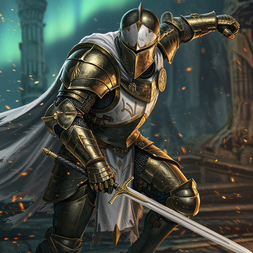 View this AI-generated image featuring a high ranking knight clad in dazzling dark gold and pristine white armor is captured in dynamic action the scene is rendered in stunning detail showcasing a close up intensity with metallic finishes that gleam under ethereal aurorapunk lighting the setting is