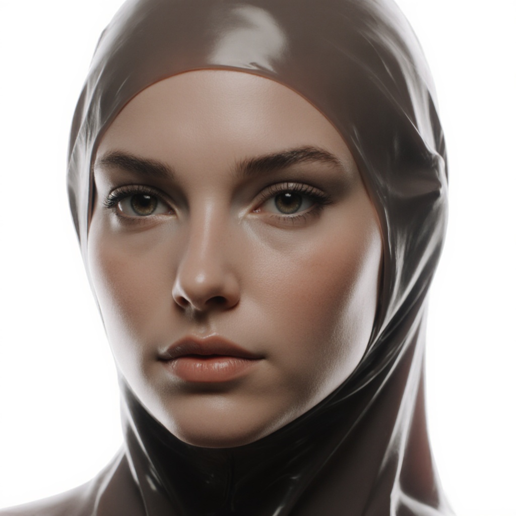 Make a lady wearing latex only on her head and face, make it hyper realistic and the background is white