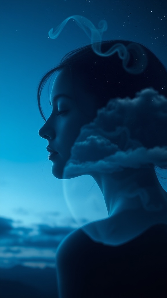 Surreal semi-realistic landscape photograph, featuring cool blue gradients transitioning from light to dark, with muted, soft tones in midnight and twilight blues just after sunset, capturing the blue hour's magical ambiance. The scene highlights a serene female profile, her skin smooth and luminous, set against a double exposure style backdrop. This backdrop consists of large, trailing, translucent wisps resembling mares tail cirrus clouds, seamlessly integrated with a star-filled night sky. The palette combines contrasting shades of blue with faint, muted hues, creating an emotionally charged, dark atmosphere. The composition is balanced yet powerful, with intricate details conveying a sense of elemental power. The luminous glow of the scene adds serenity, complemented by a dark gradient in the background that enhances its tumultuous quality. This rich interplay of colors and details fosters a soothing, meditative atmosphere, while subtle creative modifications ensure originality and maintain the core concept.