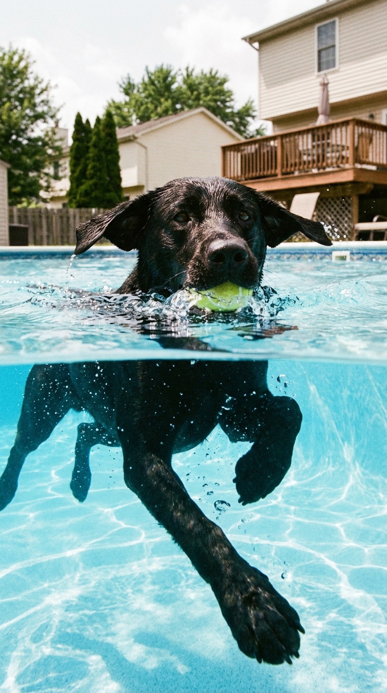 An action shot of a black lab swimming in an inground suburban swimming pool. The camera is placed meticulously on the water line, dividing the image in half, revealing both the dogs head above water holding a tennis ball in it's mouth, and it's paws paddling underwater.