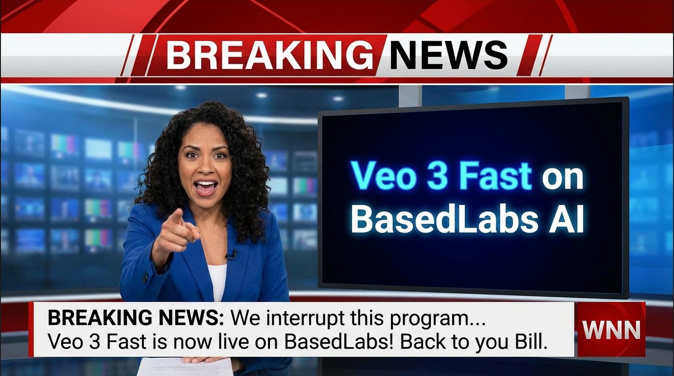 A breaking news ident, followed by a latina TV news presenter excitedly telling us: We interrupt this program to bring you some breaking news... Veo 3 Fast is now live on BasedLabs! Back to you Bill. The background says "Veo 3 Fast on BasedLabs AI"
