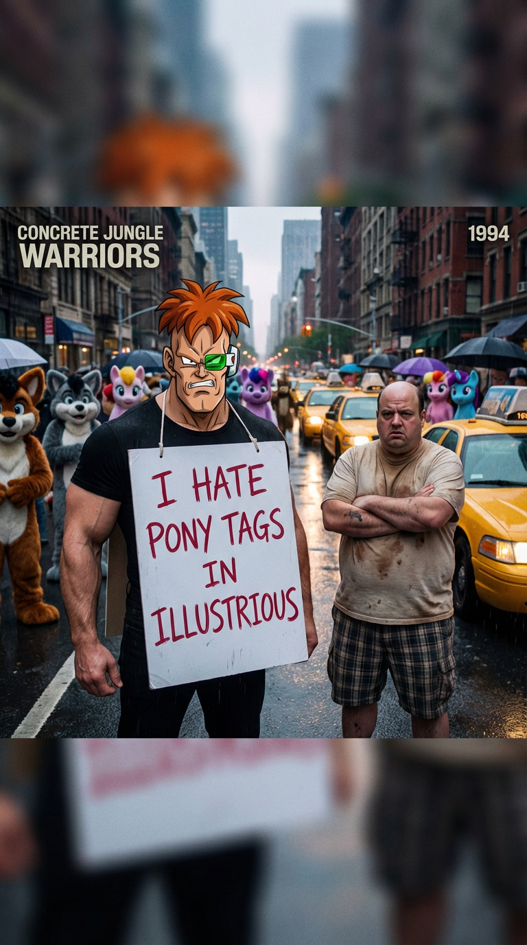 cinematic shot, 1990s action movie still, medium shot, Recoome from Dragon Ball Z, massive muscular man with spiky orange hair and a green scouter over one eye, wearing a tight black t-shirt, standing in the middle of a rainy New York City street, wearing a large white sandwich board sign on his chest that says I HATE PONY TAGS IN ILLUSTRIOUS written in rough red marker, angry expression, standing next to a heavy set bald man in a dirty beige t-shirt and plaid shorts with arms crossed, background crowd consists of various furry suit mascots and colorful cartoon ponies staring, yellow taxi cabs in traffic, wet pavement, urban city buildings, realistic lighting, 4k, highly detailed