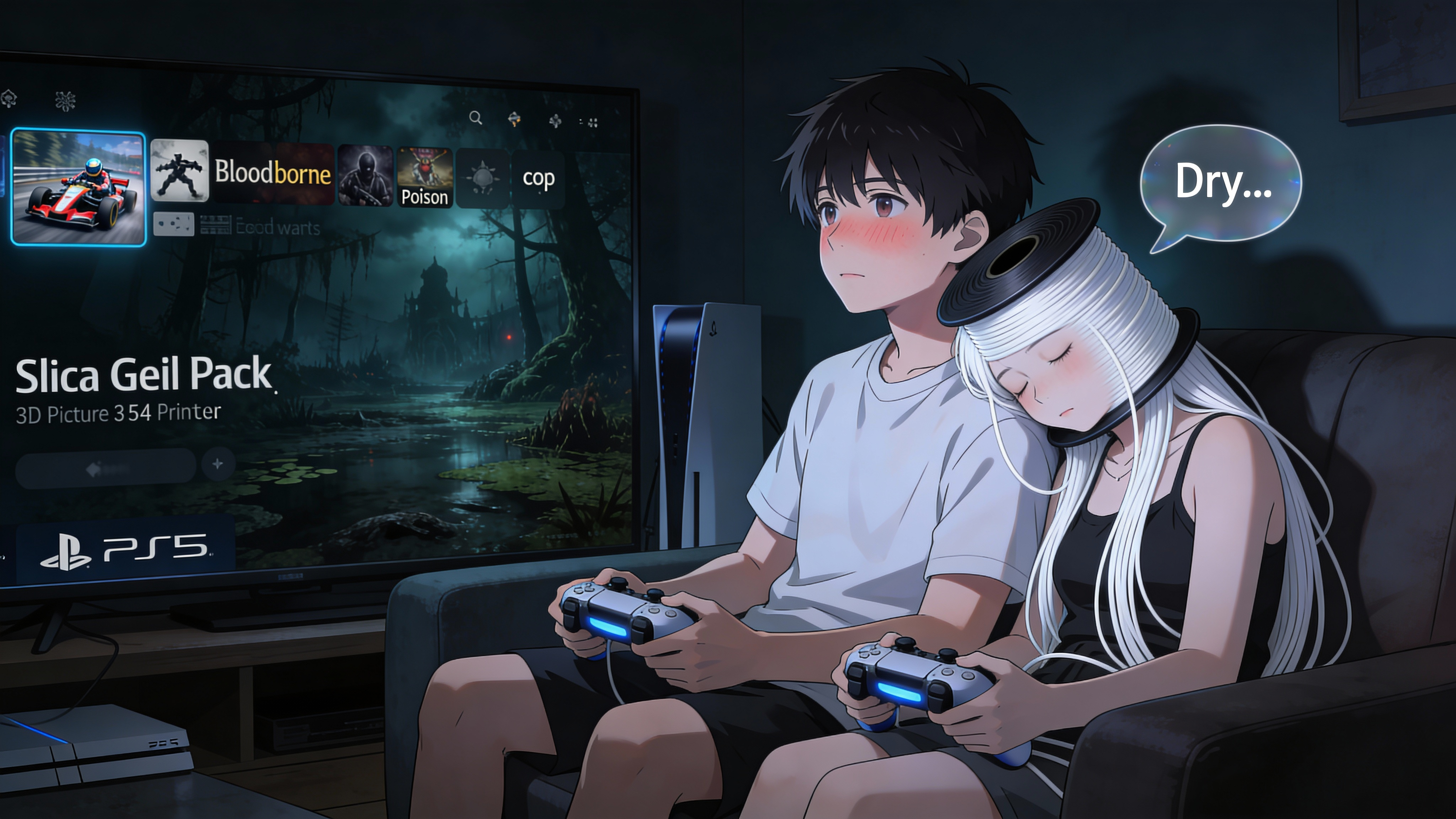 I want to make picture with characters from picture 1 and 2. Scene is like that: guy from picture 2 (Silica Gel Pack guy) is sitting on a couch with a White 3d Printer Filament Girl from picture 1. They both hold ps5 controllers, but girl is clearly asleep, resting her Spool head on guy's shoulder, saying "Dry..." through her sleep (in a semi-transparent speech bubble). The guy is quite short, and he is blushing. Anime style, dramatic lighting, dark room illuminated by weird PS5 game featuring karting, bloodborne, poison swamps, and coop. Use the style from picture 3-4