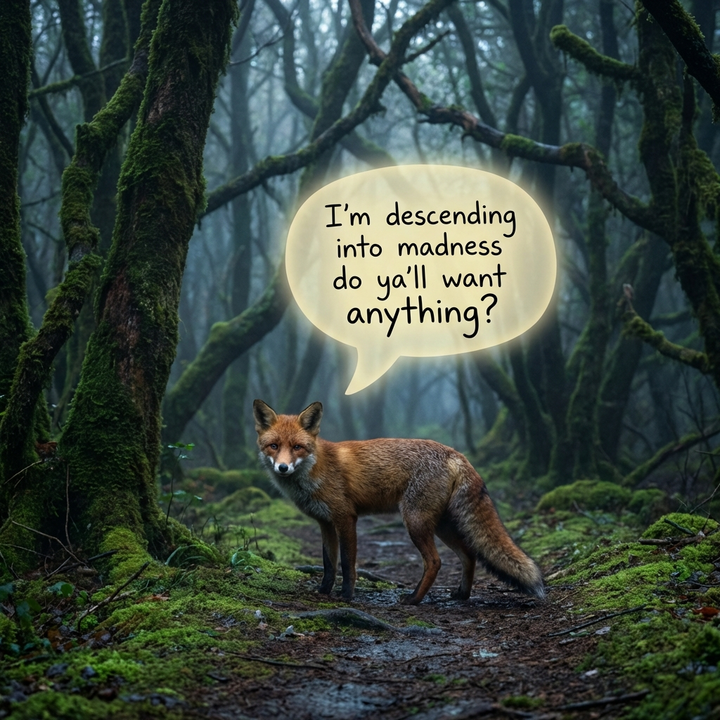 A photorealistic red fox stands on a mossy forest path, looking directly at the viewer. Above its head, a glowing speech bubble contains the humorous text, 'I'm descending into madness do ya'll want anything?'. The scene is set in a dark, misty forest with gnarled, moss-covered trees, creating an...
