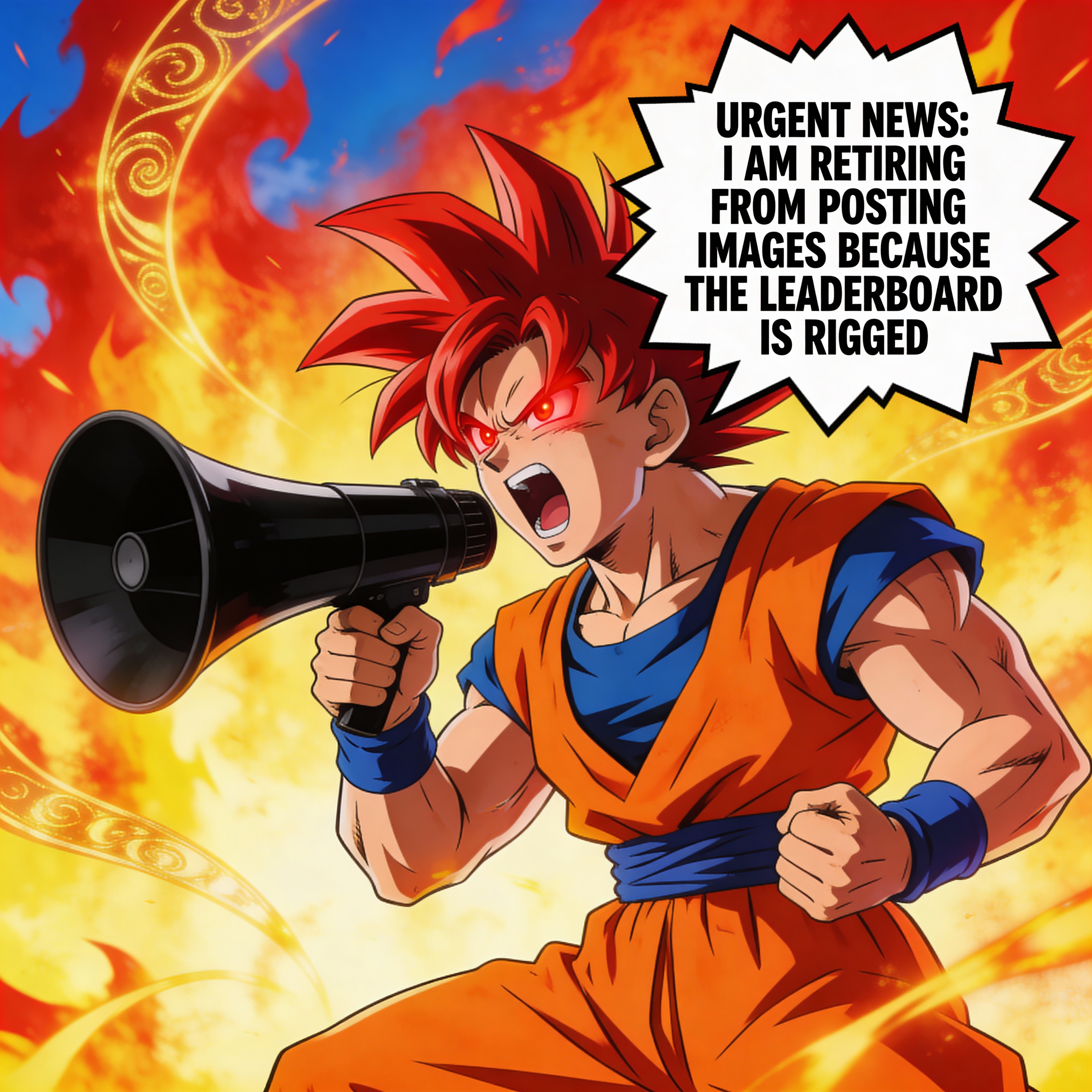 Anime style illustration of Goku in Super Saiyan God form, mid-shot, holding a black megaphone to his mouth and shouting. He has vibrant red spiky hair and glowing red eyes, wearing his signature orange gi with blue undershirt and wristbands. The background features an intense aura of red and yellow flames with swirling golden energy patterns against a partially visible blue sky. A white speech bubble with a jagged outline appears next to him, containing the bold black text: "URGENT NEWS: I AM RETIRING FROM POSTING IMAGES BECAUSE THE LEADERBOARD IS RIGGED". Dynamic, energetic lighting, vibrant colors.