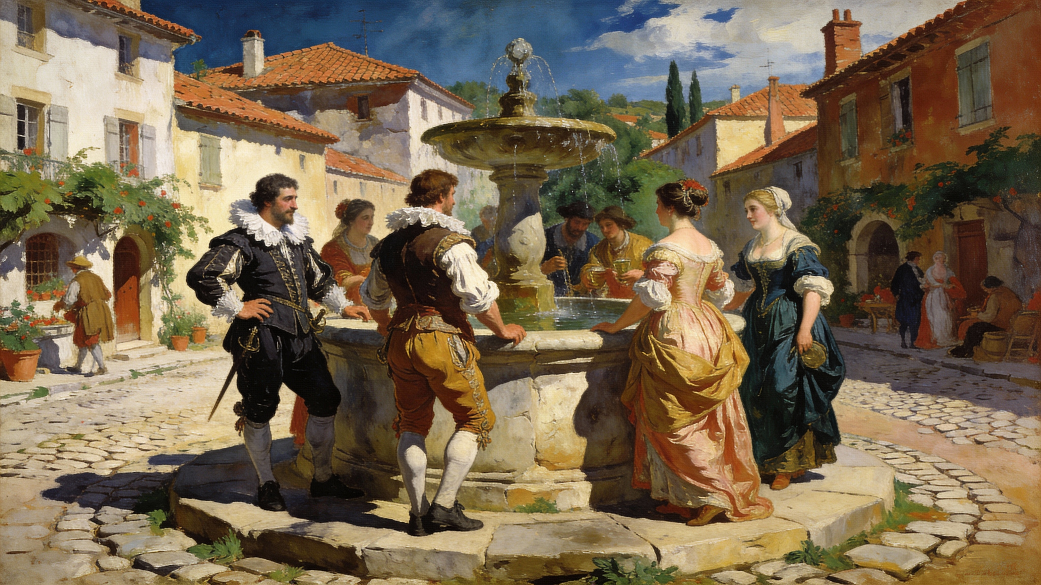 View this AI-generated image featuring close to village de france avec une fontaine et quelques habitants paolo veronese art. Created using advanced AI technology, this image showcases creative visuals, AI artwork. Perfect for creative projects, digital art, inspiration.
