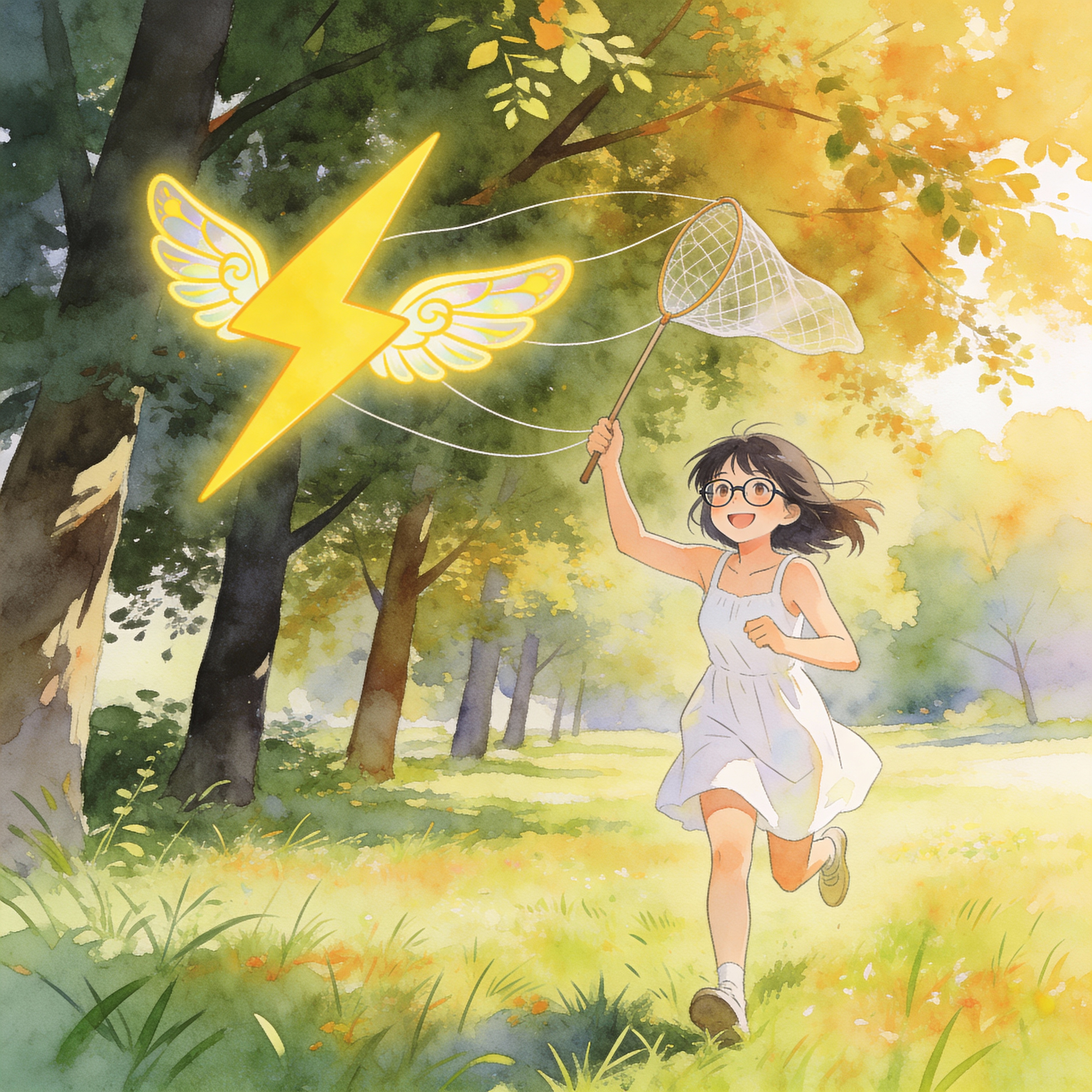 a cute anime-style illustration made with pencil and watercolor depicting a smiling young woman wearing glasses and white sundress running on a beautiful meadow lined with trees on a summer day. she is holding up a butterfly net, trying to catch a yellow thunderbolt symbol with stylized wings that is floating in front of her.
