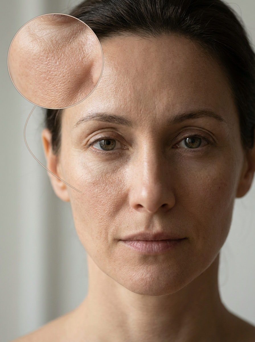 A close-up portrait of a woman's face with a magnified circle highlighting skin texture on her forehead. The image focuses on natural skin details, suitable for dermatology or beauty content.