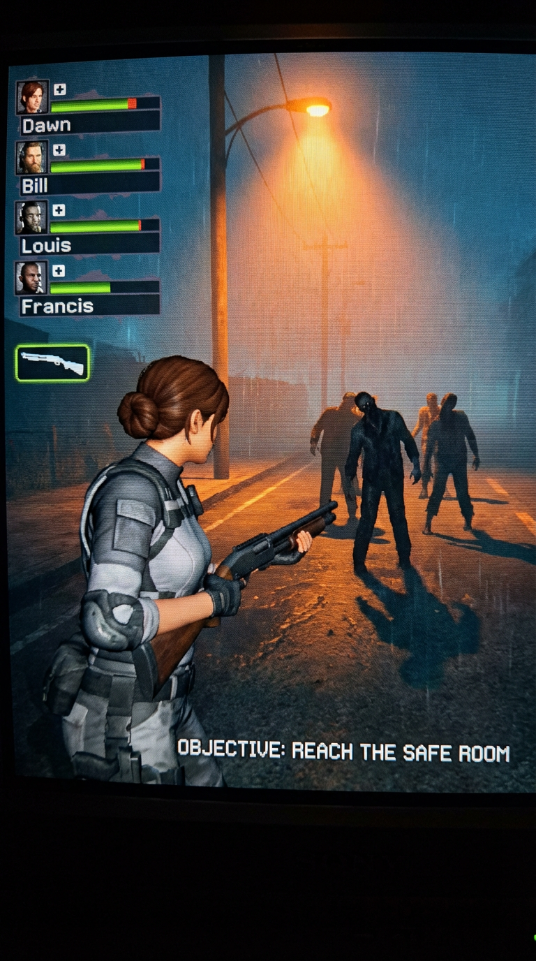 Video game screenshot, third-person perspective, survival horror, a female character in tactical gear holding a shotgun, looking to the right. She has brown hair tied in a bun and is wearing grey and white body armor. In the background, multiple zombies are shambling towards the player through a dark, foggy city street at night. A bright orange streetlamp illuminates the scene, casting long shadows. The mood is tense and urgent. Dark blues, greys, and oranges dominate the color palette. UI elements are visible: player health bars, character portraits (Dawn, Bill, Louis, Francis), weapon inventory, and the objective "Reach the Safe Room." The art style is 3D game graphics, reminiscent of Left 4 Dead.