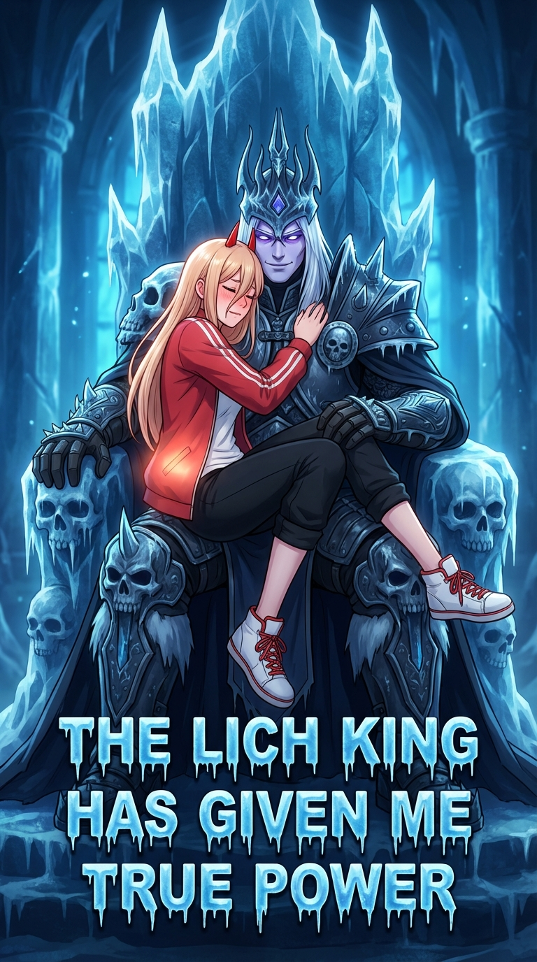 Anime style illustration, The Lich King from World of Warcraft sitting on his ice throne, with a pleased expression, long white hair, purple eyes, and full armor, cradling Power from Chainsaw Man on his lap. Power has long blonde hair, red horns, wearing a red jacket, white shirt, black pants, and white sneakers with red laces, hugging The Lich King and blushing with closed eyes. The throne is icy, adorned with skulls. Dark, cool blue lighting creates a cold, ethereal mood. Dominant colors are blues, grays, and whites, with Power's red jacket providing a warm contrast. Text overlay: "THE LICH KING HAS GIVEN ME TRUE POWER," in icy blue, dripping font.