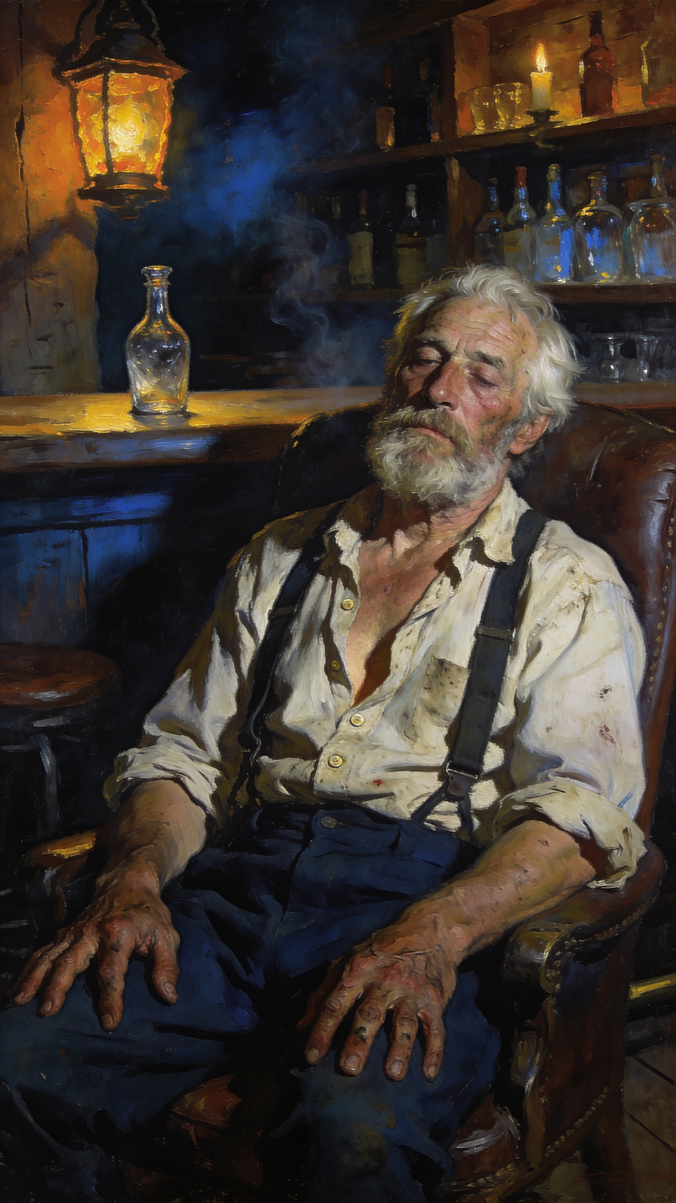 Seated weary old White haired unshaven drunken man in a rustic tavern, slouched in a worn leather armchair, hands resting on his knees, wearing an old rumpled dirty off-white button-up shirt with sleeves rolled to the elbows, dark suspenders, worn navy trousers, unbuttoned collar, fabric wrinkles and subtle stains, rough weathered hands with visible veins and grime, warm amber rim light from a nearby lantern and candlelight, deep dramatic shadows and strong chiaroscuro, wooden bar and shelves lined with glass bottles and a single decanter in the background, faint smoke and haze, painterly oil painting aesthetic inspired by Rockwell /Rembrandt/Caravaggio, thick visible brushstrokes, textured canvas grain, ultra-detailed, cinematic mood, golden highlights and cool blue shadow contrast, shallow depth of field, soft bokeh, film grain, high dynamic range, 8k, hyperreal yet painterly