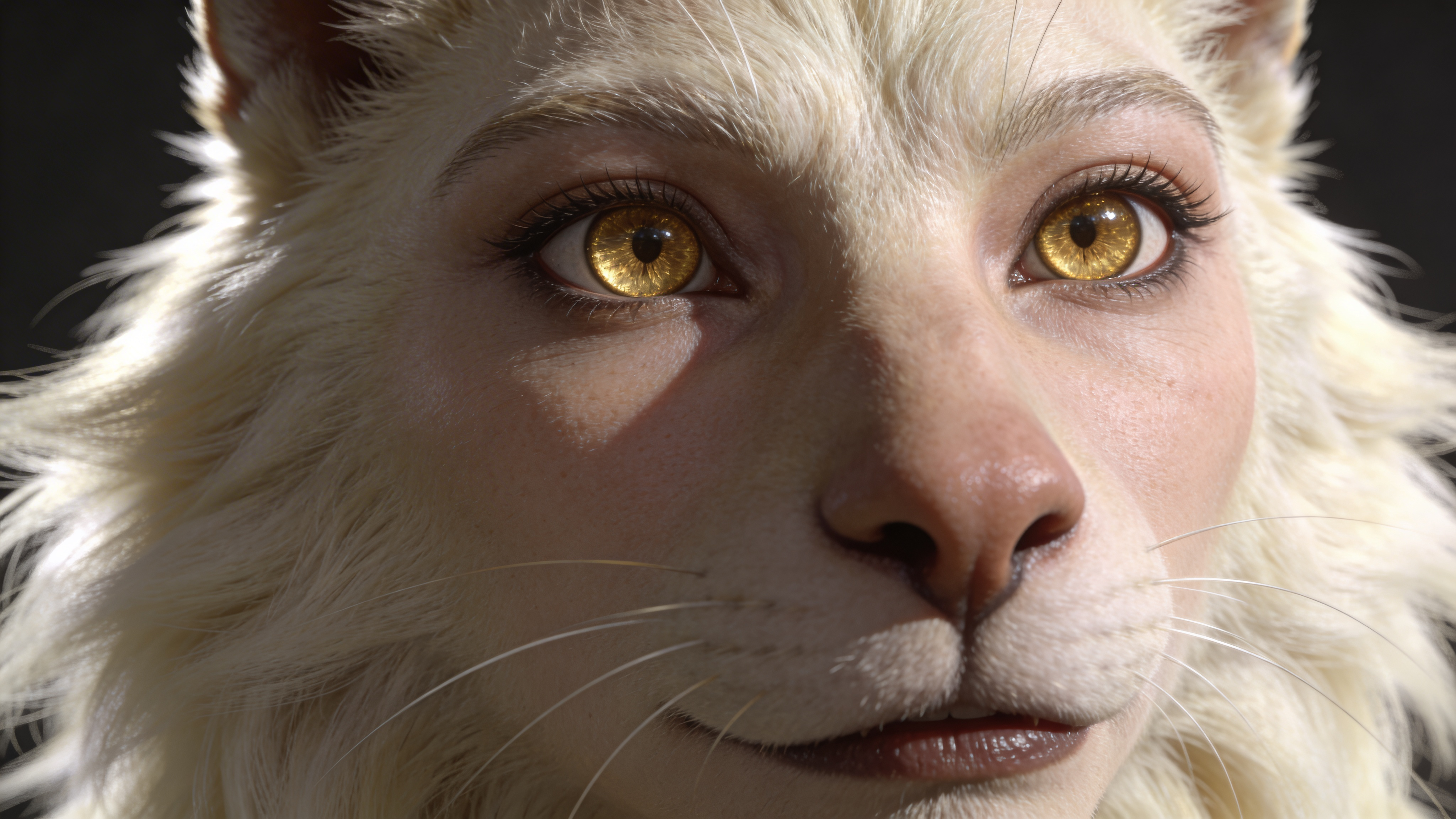 She is anthropomorphic, her eyes are golden. Her fur is medium cream color. She is mature, she is female. She has round pupil eyes. Make sure she does not get stretched, squished, or deformed; Dramatic low-angle close-up of her. highly detailed, face focus, photorealistic, 4k resolution, SFW