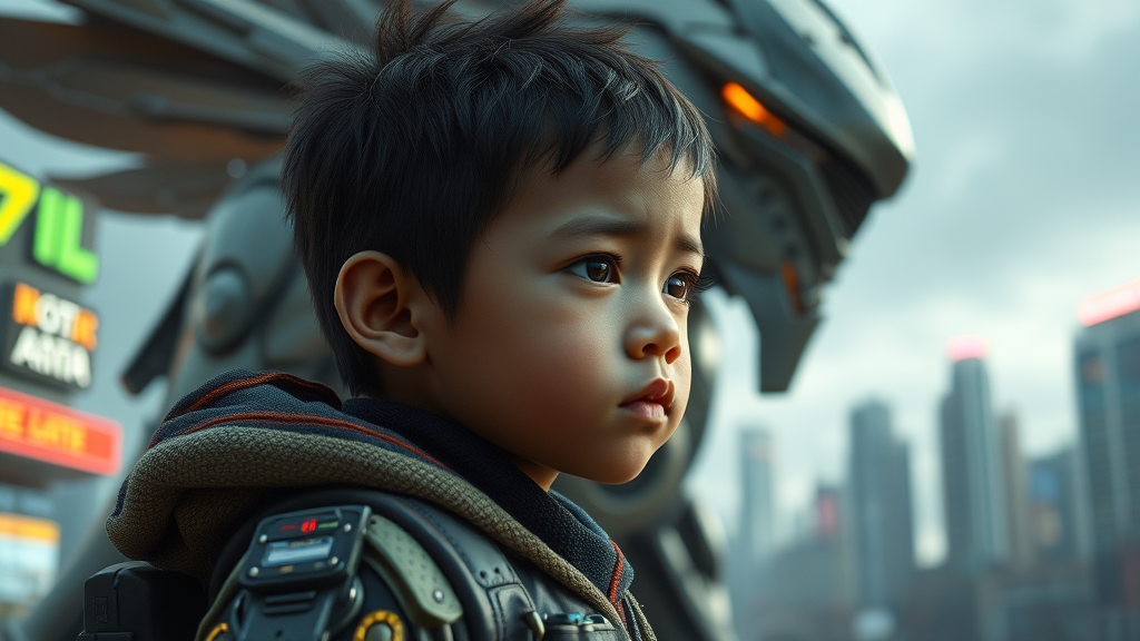 Coatl full body portrait of a young child in a cyberpunk setting, with a massive mecha looming in the blurred cityscape backdrop, artstation, ultra-high definition, detailed octane render, unreal engine, intricately detailed, concept art, hyper-realistic, exemplary craftsmanship, crisp imagery, adhering to the rule of thirds.