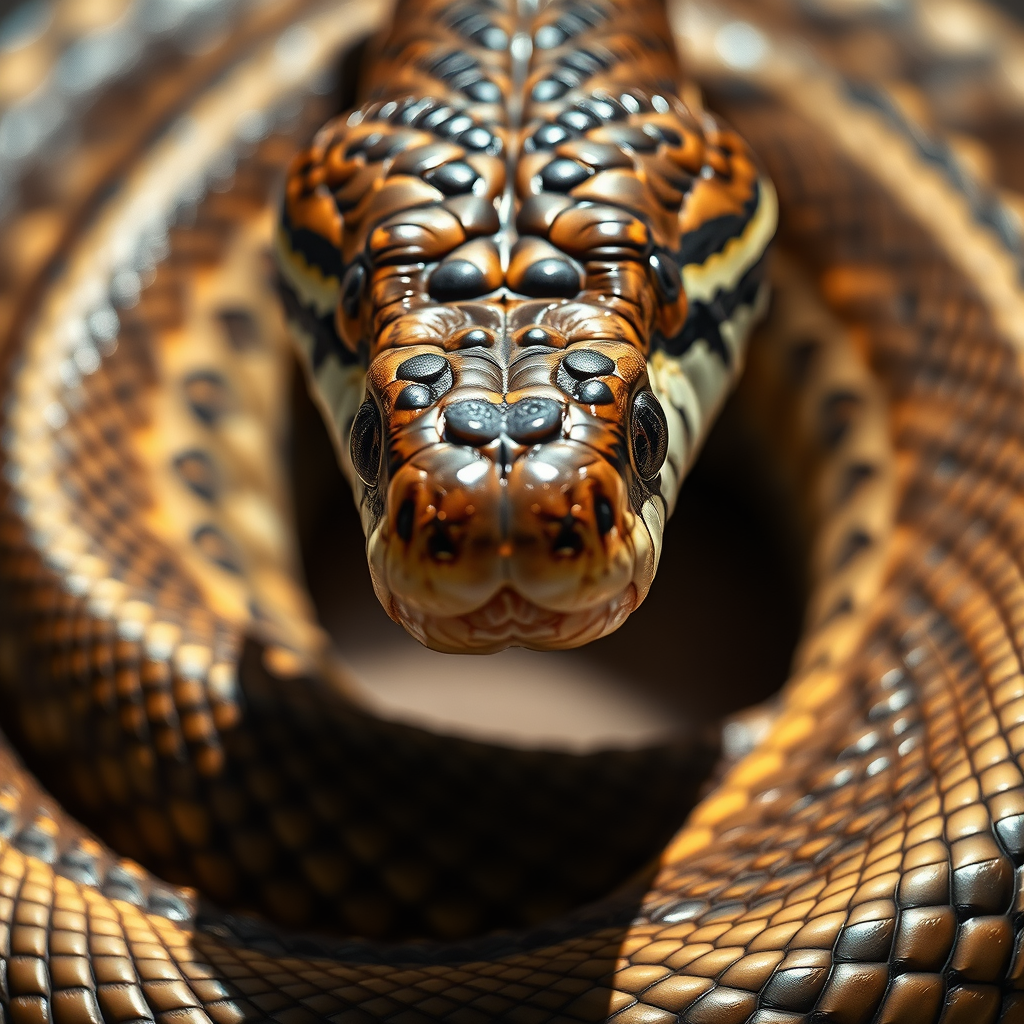 Coiled eastern diamondback rattlesnake preparing to strike, intense gaze, macro perspective, rich depth, captured in 22 megapixels, ray-traced shadows, pristine natural lighting, hyper-photorealistic detail, ultra high-definition, extreme close-up, photographed with a 70mm lens, showcasing intricate texture, lifelike scales, vivid coloration, dynamic composition, shot with precision.