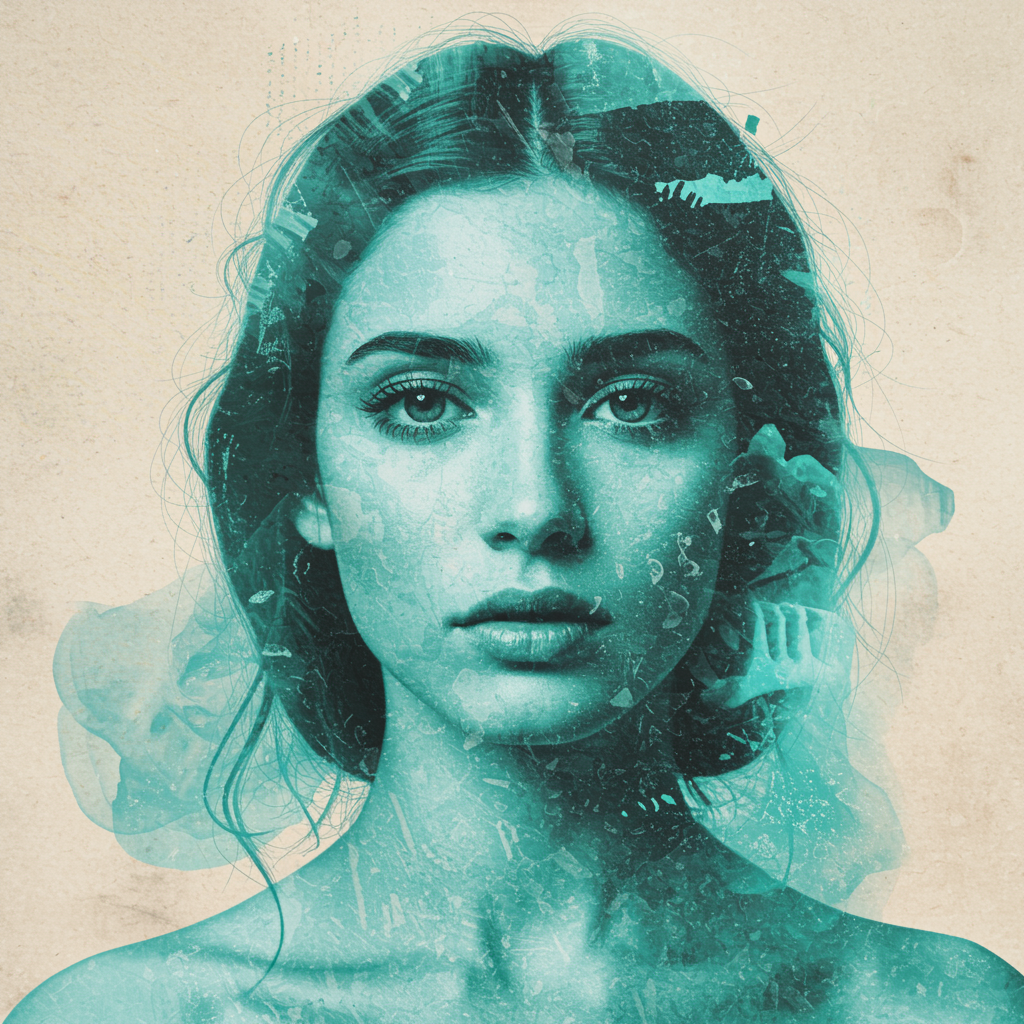 Collage of a woman's face in the style of Josef Kote, embodying grunge beauty with influences of Dain Yoon. The artwork features a palette dominated by cyan and blue, with highly detailed realism. It presents a multi-layered composition reminiscent of Antonio Mancini, blending abstract and realistic elements seamlessly. The piece captures an ethereal and textured essence, highlighting intricate patterns and fluid transitions.