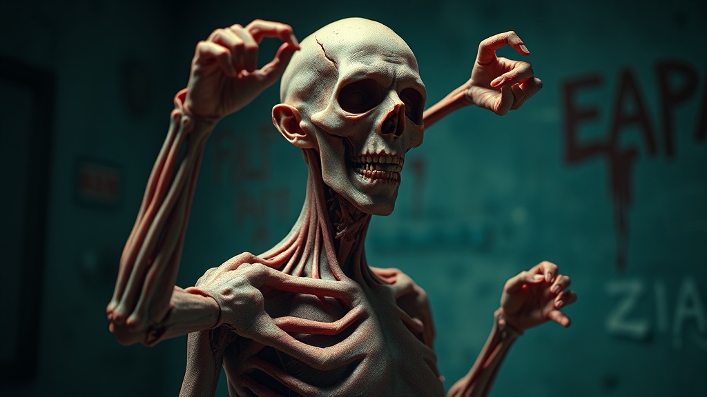 A hyperrealistic color photo in the style of AD Magazine Photography with cinematic lighting and raytracing, emphasizing depth of field and vibrant colors. The scene features a figure with distorted anatomy, showcasing extra, missing, or disconnected limbs, resulting in a surreal and mutated form that borders on the grotesque and unsettling, yet captured with photorealistic detail and clarity.