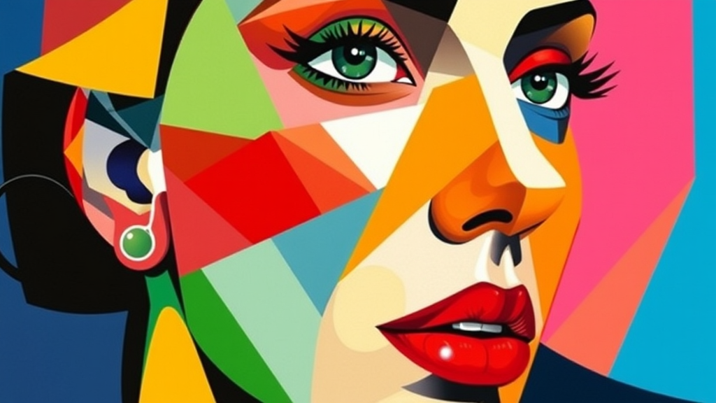 Colorful and abstract portrayal of a woman's visage, influenced by the cubist style of Pablo Picasso, featuring dynamic and fragmented geometric shapes and forms. The composition uses a bold and vivid color palette, blending and juxtaposing harmonious and contrasting hues, capturing a modern and innovative reinterpretation of classical cubism with an imaginative twist.