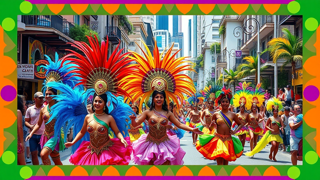 Colorful and festive Brazilian carnival scene with vibrant borders, capturing the essence of lively street celebrations, adorned with dancers in elaborate costumes and feathered headdresses, a backdrop of pulsating music and dynamic parades, all set in a lively cityscape with a tall aspect ratio of 9:16.