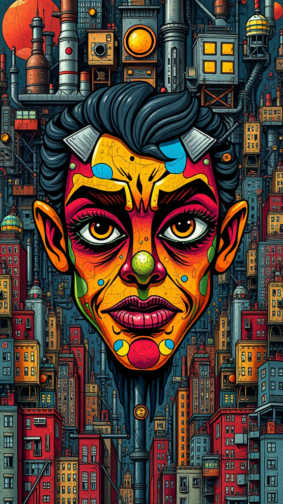 Colorful cartoon face surrounded by an intricate cityscape, inspired by Tim Doyle's style. Incorporates industrial forms with an abundance of hidden details, exhibiting a darkly detailed aesthetic reminiscent of a solarizing master. Blends elements of Agustín Fernández with a focus on poster art, featuring a dense urban environment that merges seamlessly with the central vibrant face. The composition offers a surreal and complex visual experience, with layers of detail that invite exploration.