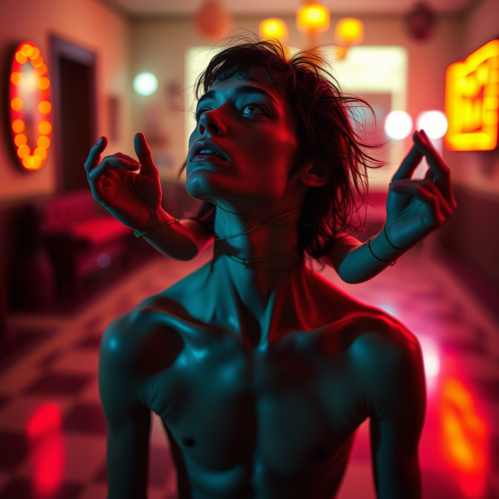 Colorful, hyperrealistic photo capturing a surreal scene with cinematic lighting, embracing depth of field and vibrant colors reminiscent of AD Magazine Photography. The image features a perplexing display of anatomy with a figure exhibiting extra or floating limbs, creating a sense of mutation and disconnection. The overall composition teeters between beauty and the grotesque, providing a visually striking contrast with elements that appear distorted and intriguingly blurred.