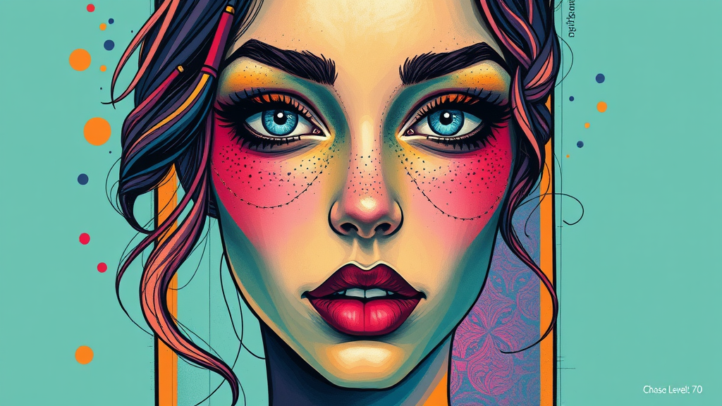 Colorful illustration depicting a woman's face with an emphasis on vibrant hues, set against a vertical rectangular frame, artistic chaos level of 70, enhanced with intricate details and soft abstract patterns, maintaining a stylized aesthetic with a touch of whimsy and surrealism.
