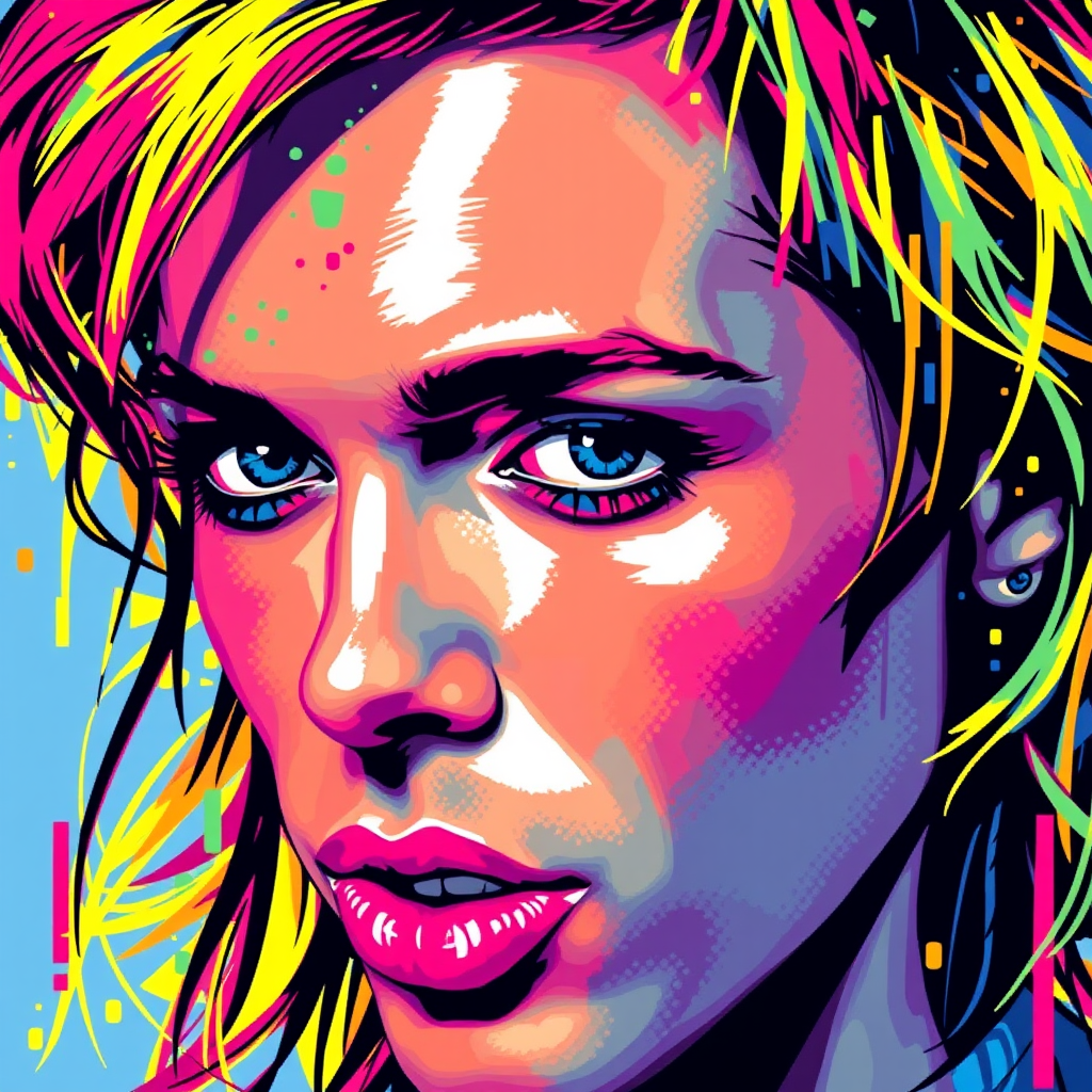 Colorful pixel art of a famous pop singer's face, focusing on vibrant patterns and abstract details.