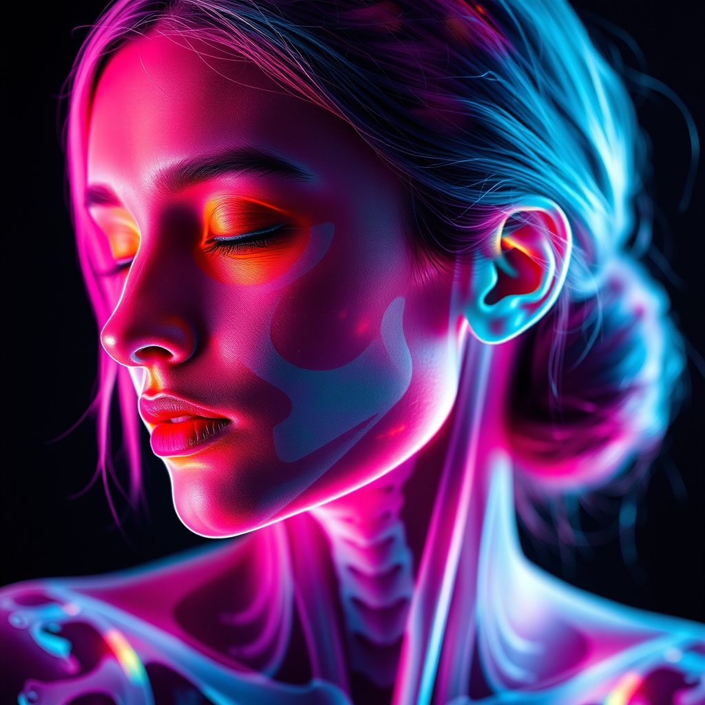 Colorful X-ray style photograph of a model, inspired by Yigal Ozeri, showcasing monochromatic serenity with a 32k resolution, macro perspective. The image features a rich blend of colors, balancing the ethereal quality of an X-ray with the detailed depth of macro photography, evoking a sense of tranquility and grandeur.