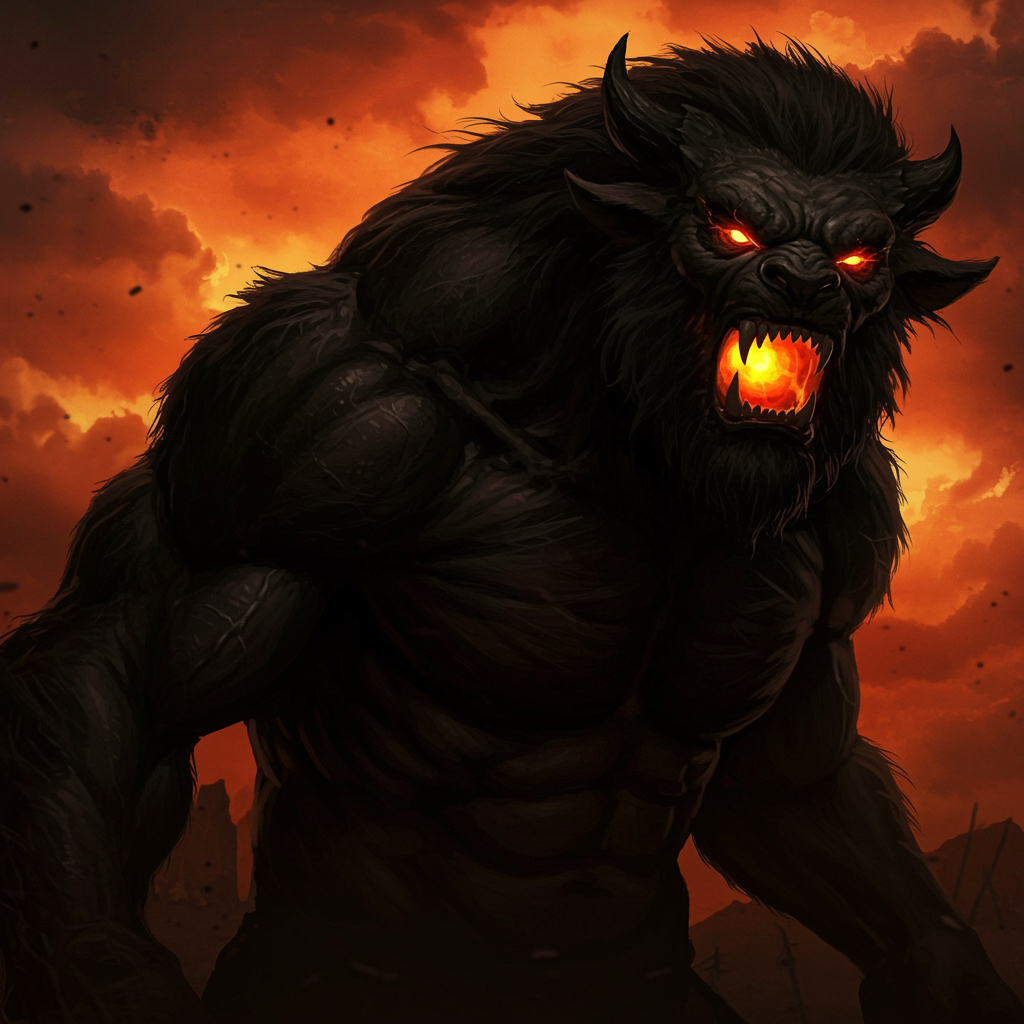 Colossal beast, shrouded in shadows, poised menacingly with fierce stance, epic fury, seething with raw emotion, intense wrath, overwhelming strength, primal tribal dark fantasy ambiance.