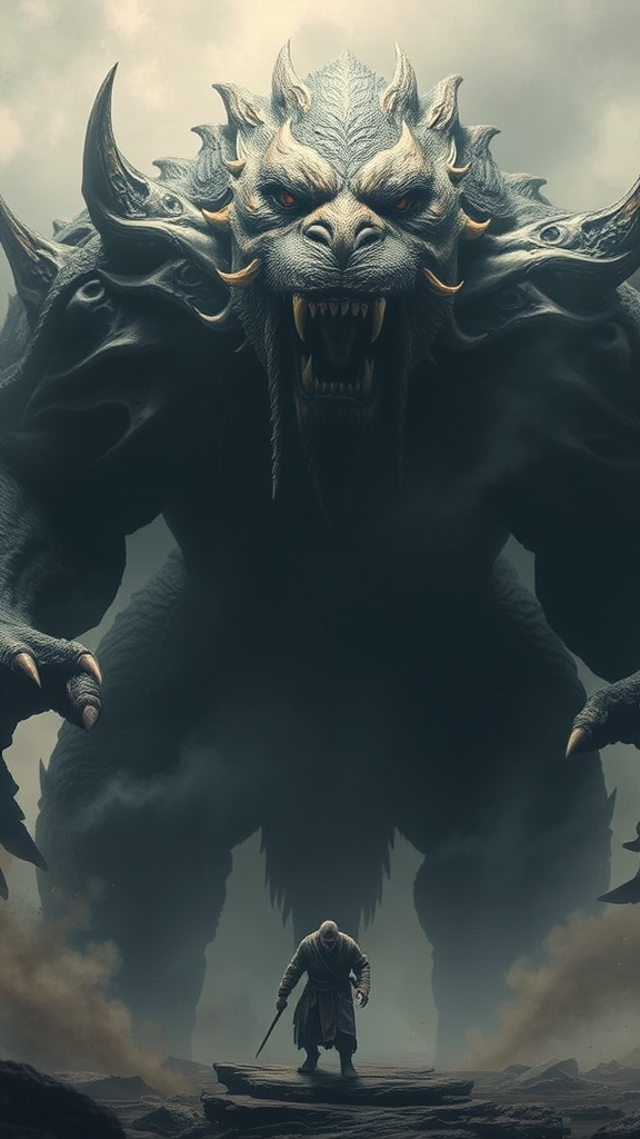 Colossal beast, shrouded in shadows, poised menacingly; intense passion, fury, wrath, primal force, tribal dark fantasy.