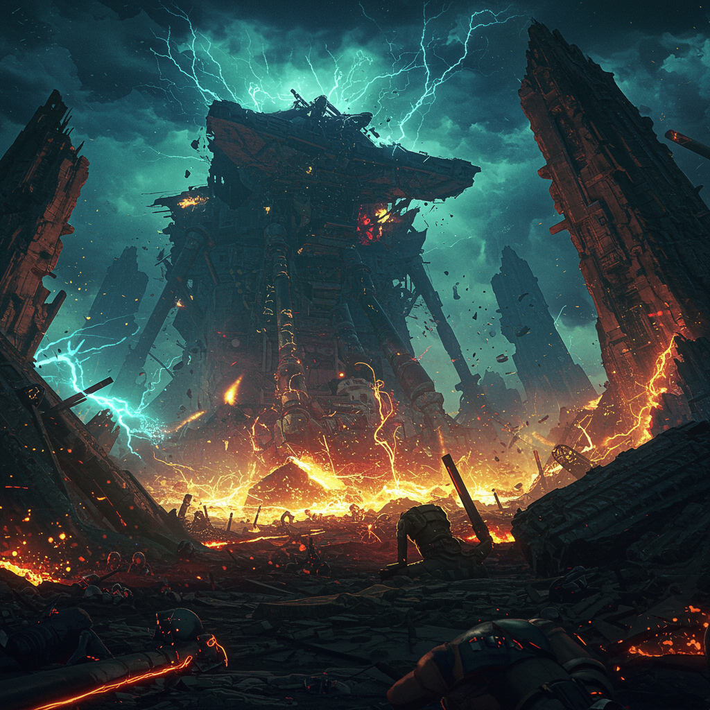 Colossal chaos unfolds in a breathtaking landscape, teeming with super-detailed artistry and vivid depth. The scene embodies a monumental vision of destruction, akin to Akira's vast imaginings, enveloped in a dark, immersive atmosphere. The towering forms and intricate textures are brought to life in stunning 8K resolution, capturing every fragment of detail with Full-HD clarity. The spectacle is suffused with a radiant plasma glow, emphasizing the sheer scale and intensity of the scene.